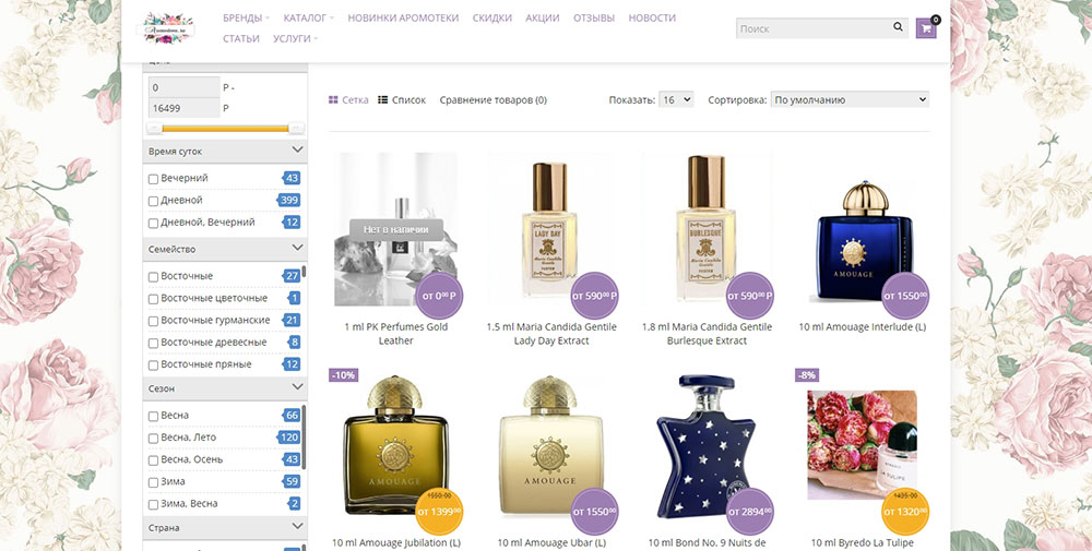 Выбирать парфюмерию на этой торговой площадке очень удобно – есть фильтрация по бренду, гендерным и возрастным особенностям, типу аромата, ключевым нотам и цене. Отдельные категории отведены последним новинкам, свежим поступлениям, подарочным и скидочным товарам.