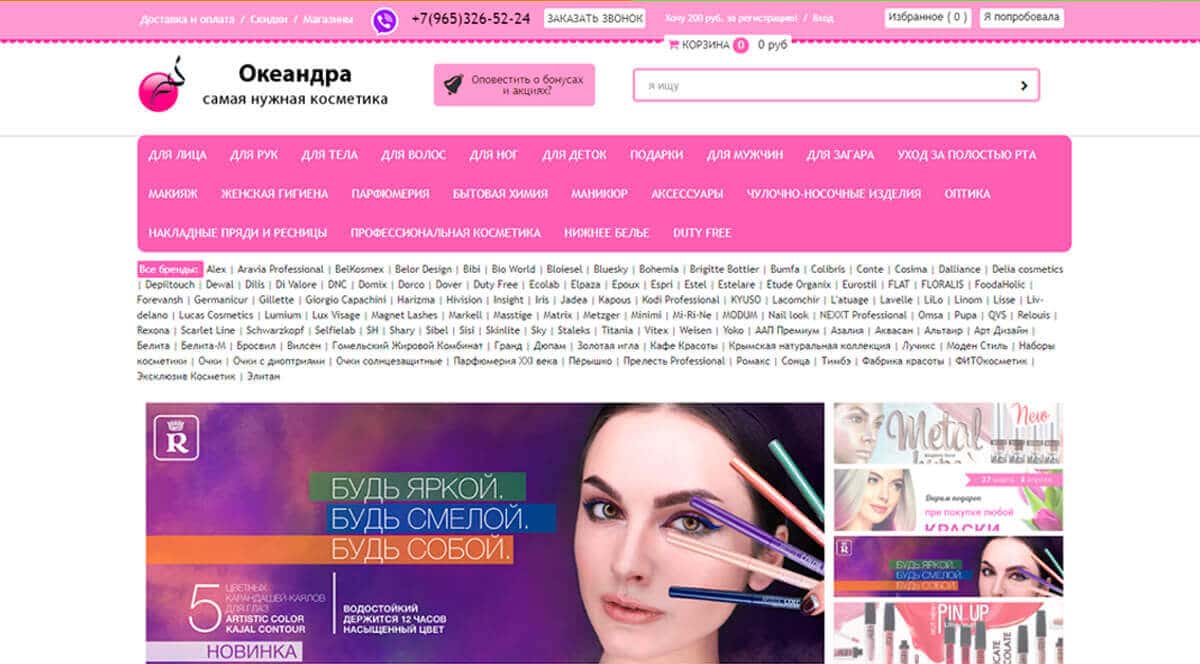 Разнообразие товара не уступает конкурентами в рейтинге косметических интернет магазинов. В категориях на сайте Okeandra можно найти: маски для лица, кремы для загара, блеск для губ, помаду, туш и многое другое. Вся палитра цветов для макияжа высокого качества не отстает от современных трендов.