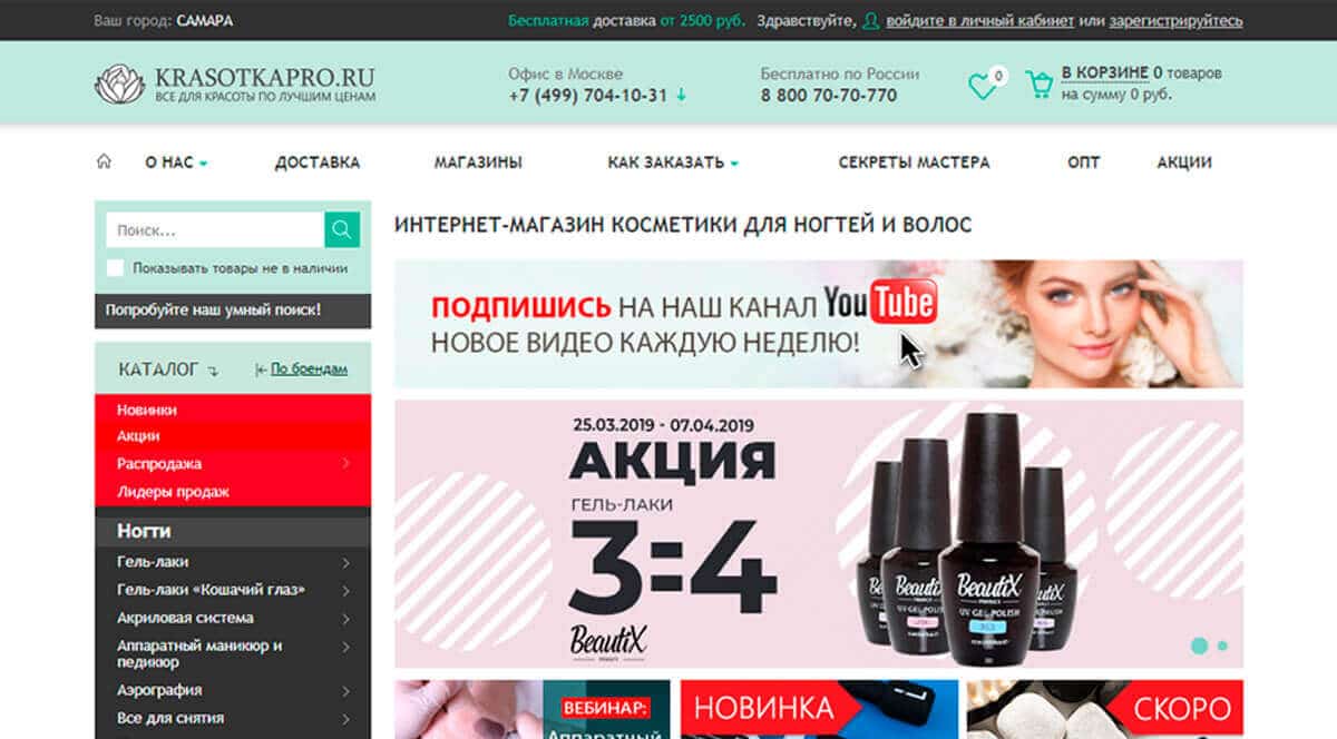 KrasotkaPro крупнейший в России ритейлер красоты, предлагает более 20000 товаров, включая более 6 000 цветов гель-лаков, от более 100 брендов. На сайте доступны: косметика для лица и волос, инструменты по уходу, декоративная косметика, кисти, лаки и краски. Здесь действительно огромный выбор женских принадлежностей.