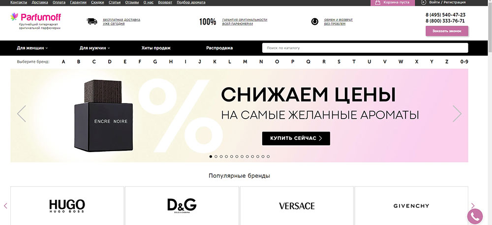 Сайт может похвастаться огромным ассортиментом с богатым выбором брендовых ароматов, расположенных в алфавитном порядке. Здесь продаются исключительно оригинальные мужские и женские ароматы элитарного класса. Клиенты отмечают удобный и внимательный сервис, оперативную обработку заказа, быструю доставку и грамотную помощь в выборе подходящего аромата.