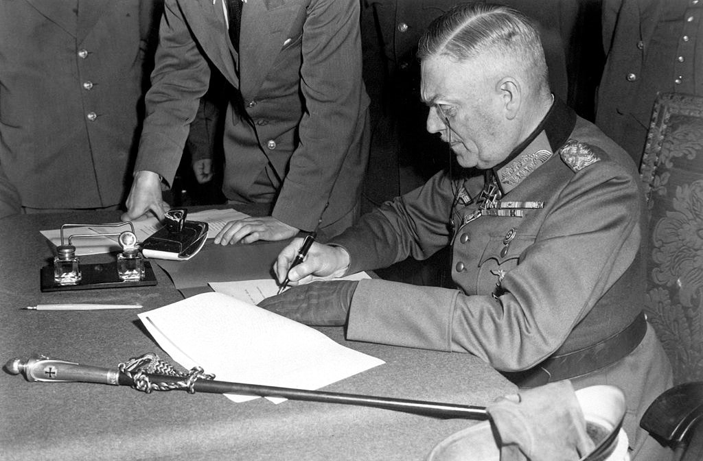 Генерал-фельдмаршал Вильгельм Кейтель подписывает акт о безоговорочной капитуляции германского вермахта в штабе 5-й ударной армии в Карлсхорсте, Берлин