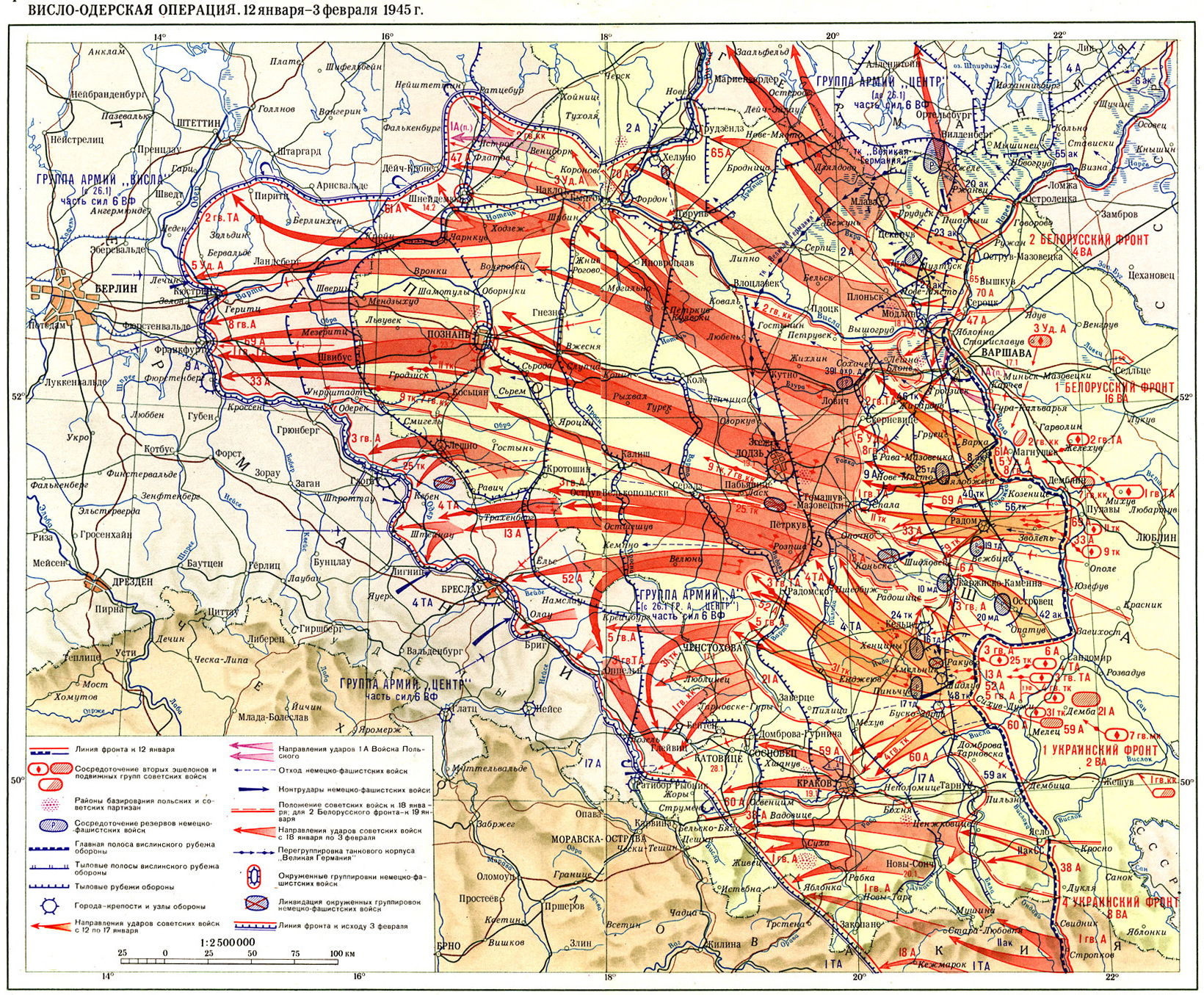 После разгрома варшавской группировки вермахта соединения РККА и Войска польского продолжили развивать интенсивное наступление на других направлениях. 3 февраля советские части вышли к Одеру, остановившись в 60—70 км от Берлина.