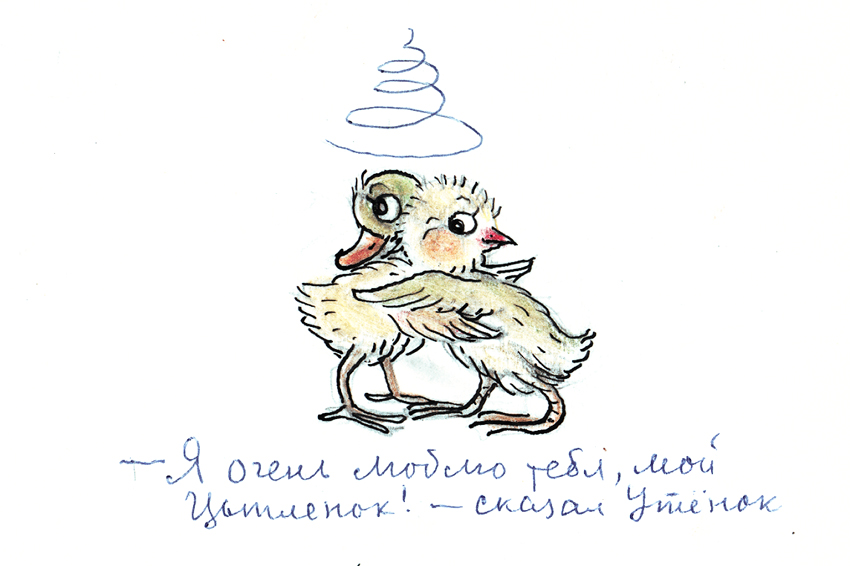 Владимир Григорьевич писал Татьяне письма -длинные, пронзительные. В них он называл себя Утенком, а ее — Цыпленком, совсем как в сказке, которую сочинил сам. В Таранович художник находил вдохновение и каждую иллюстрацию посвящал ей. «Вы, конечно, знаете: все кошки, собачки, зайцы, уточки и птицы объясняются вам в любви», — признавался он. Ради своей Тани Сутеев бросил курить, пообещал ей больше не брать в рот ни капли спиртного. Однако все было тщетно: верная жена, она не могла оставить мужа.