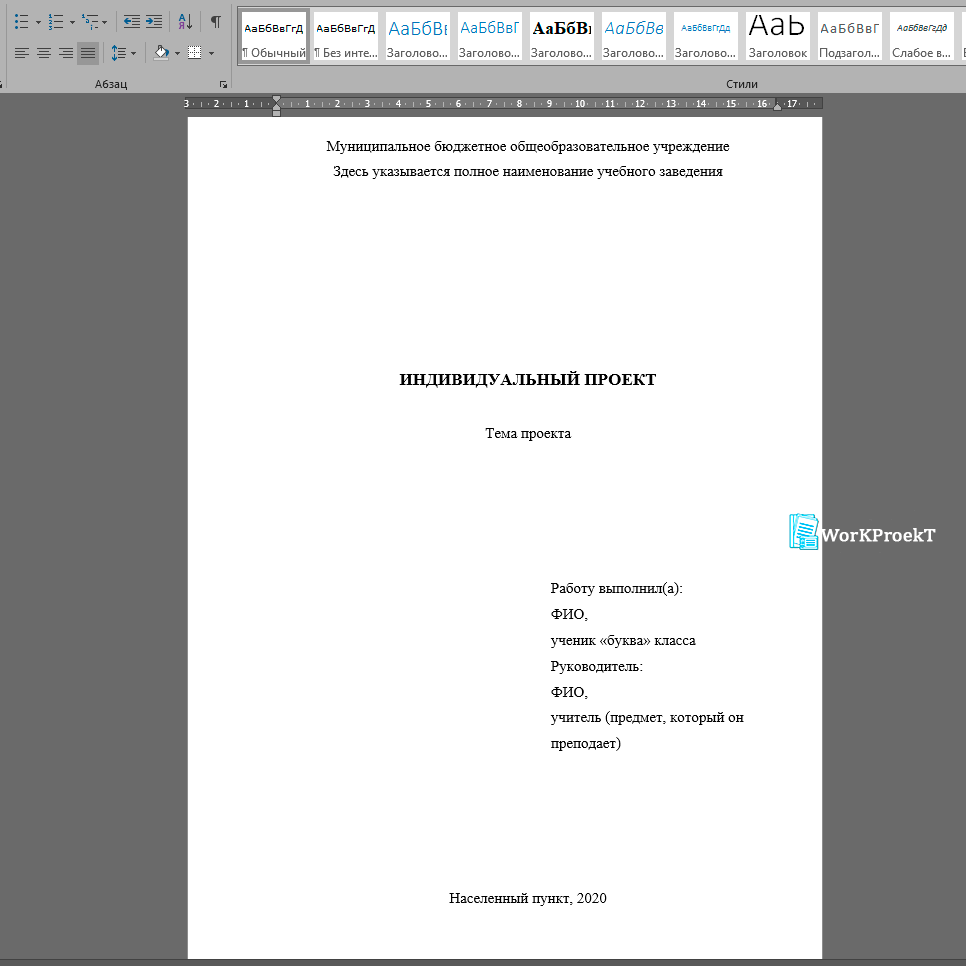 Первым листом любой проектной работы является «Титульный лист», на котором указываются школа, название работы, данные ученика, учителя, населенный пункт и год написания (подробнее можно прочитать здесь)