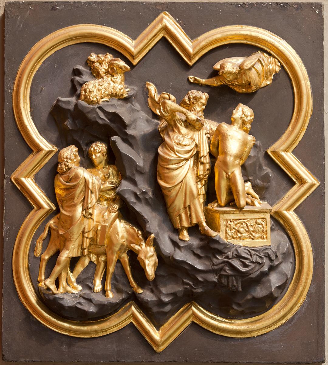 В отличие от прочих жанров искусства, в скульптуре есть вполне однозначная дата, с которой начинается Ренессанс. Это 1401 год, когда прошел открытый конкурс на лучшее украшение для северных ворот баптистерия (здания, где совершали обряд крещения) во Флоренции. Конкурсным заданием было обыграть сюжет «Жертвоприношение Авраама» в рельефе, а победила работа молодого скульптора Лоренцо Гиберти (1378-1455):