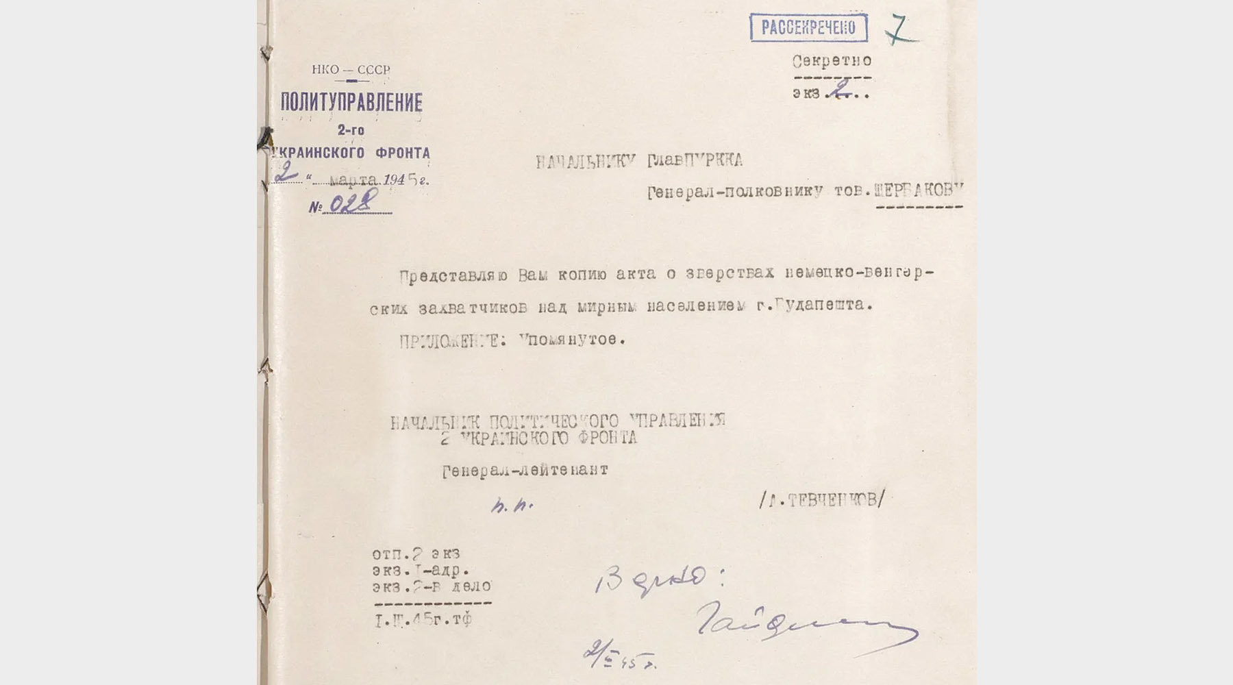 В обнародованном Минобороны Акте о зверствах в городе Будапешт содержатся свидетельства преступлений, совершённых нацистами непосредственно в столице Венгрии.