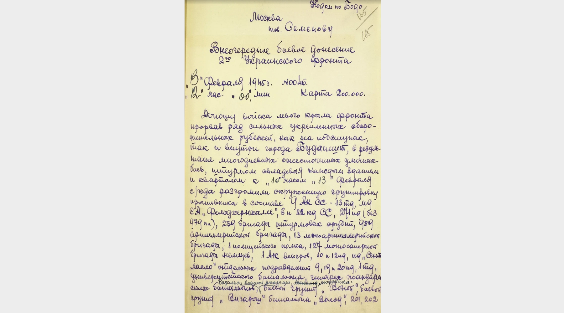 В документе приводится также статистика боевых действий: «За период боёв за город Будапешт войсками фронта из числа окружённой группировки уничтожено: солдат и офицеров — 49 982, танков и самоходных орудий — 203, орудий разного калибра — 367, бронемашин и бронетранспортёров — 253, миномётов — 490, пулемётов — 1591, самолётов —189. Захвачено: пленённых солдат и офицеров — 127 202, танков и СУ — 269, орудий разного калибра — 1257, бронемашин и бронетранспортёров — 83, миномётов — 476, пулемётов — 1431, винтовок и автоматов — 41 тыс., самолётов — 15 и так далее».