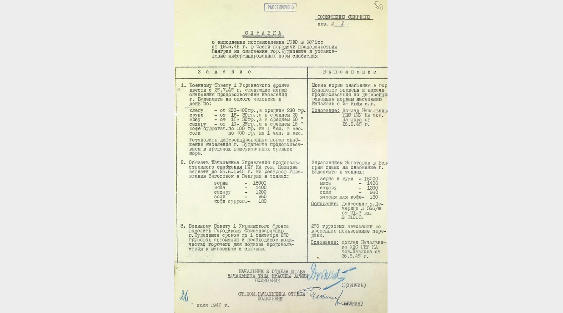Жителям Будапешта гарантировались личные и имущественные права, причем распространялись эти гарантии и на собственников бизнеса. Вплоть до того, что при бегстве последних военный комендант назначал временных руководителей из числа бывших служащих. Вместе с тем в заключительной части постановления говорится о необходимости развернуть закупки продовольствия и промтоваров по ценам, назначенным постановлением ГКО.