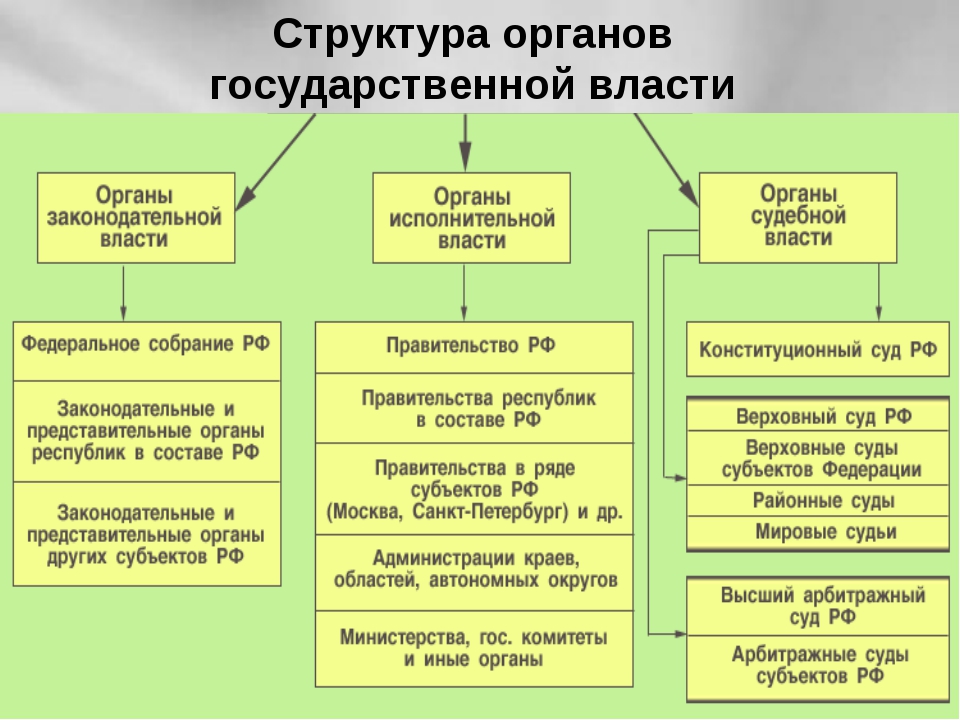 Органы законодательно власти – органы, формирующиеся с помощью избирательного процесса, представлены законодательными образованиями. Главная роль органов – обеспечение правомерности. Органы исполнительной власти носят назначаемый тип и обязуются исполнять законы, прописанные в Конституции РФ.