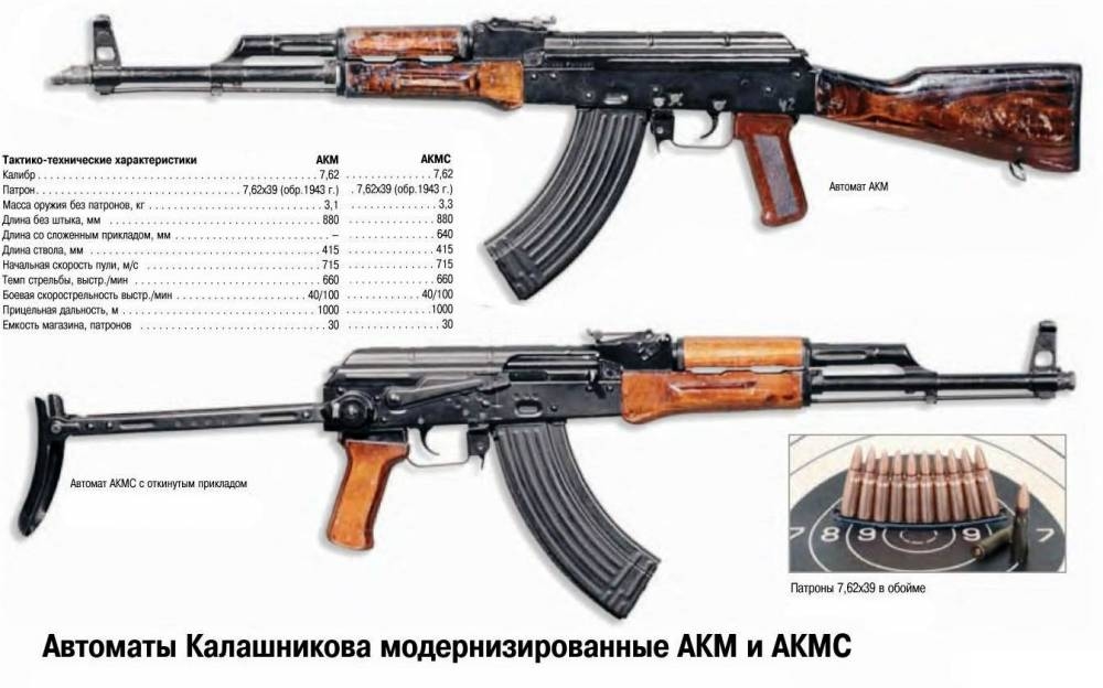 | AKМ (1959) | 7,62 × 39 мм | 16,3 г | 30 патр. магазин — 0,66 кг | 15 магазинов — 9,9 кг на 450 патронов |