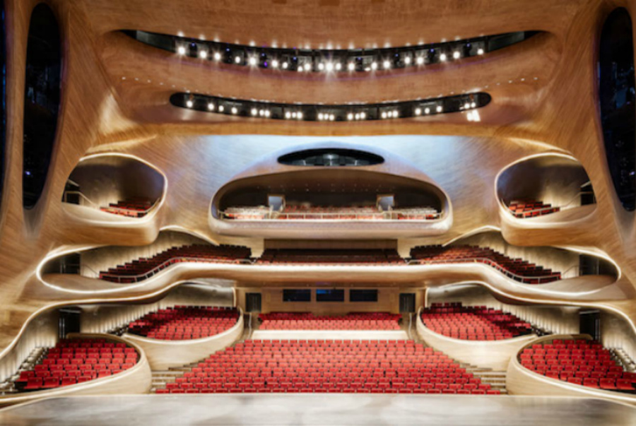 Отделка стен из маньчжурского ясеня аккуратно обтекает главную сцену и сидения в Большом театре. Освещение в нем частично естественное и проникает в зал из узких окон-просветов. А особая пространственная конфигурация зала обеспечивает акустику мирового класса.