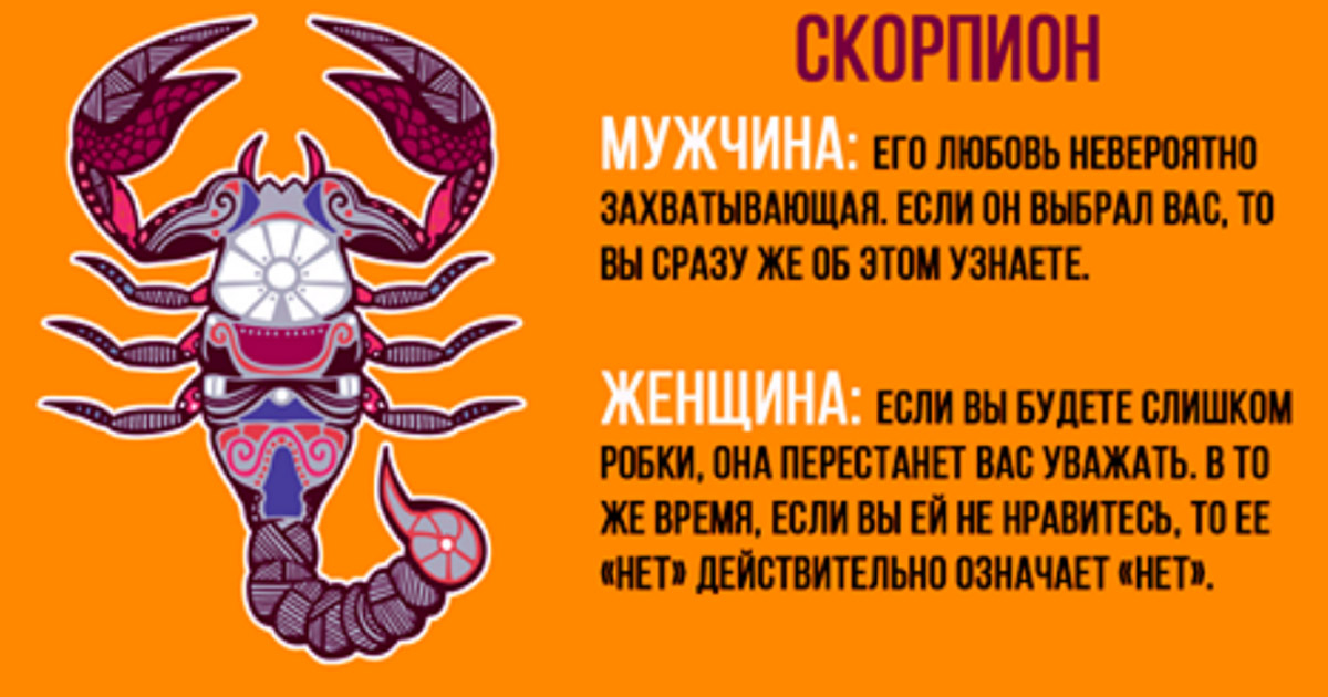 Скорпион не любит банальностей и простоты, не терпит фамильярности и панибратства, всегда защищает свои границы от чужого вторжения и легко нарушает чужие, не задумываясь о том, насколько это может быть вам неприятно. Представители знака Скорпион – самые загадочные люди на земле, но именно они особо остро нуждаются в любви, и если вдруг её получают, становятся самыми счастливыми людьми, способными на настоящие подвиги ради своих любимых.